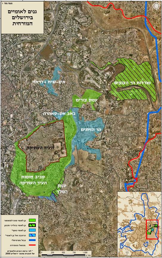 - ירושלים היא העיר היחידה בארץ שבתחום שטחה הבנוי מתוכננים ומוכרזים גנים לאומיים. בערים אחרות (כמו אשקלון, קיסריה, פתח תקווה וראש העין) יש גנים לאומיים אבל לא בשטח בנוי. גם שם, הגנים הלאומיים מהווים מקור למחלוקת בין הרשות המוניציפאלית לבין רט"ג, שמייצגים אינטרסים מנוגדים. במזרח ירושלים, לעומת זאת, העירייה היא הכוח המניע בהפיכת השטחים הפתוחים לגנים לאומיים, תוך התנערות מחובותיה לרווחת התושבים וצרכיהם.