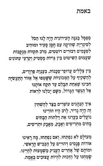 הפראות הזאת, התחושה של לגדול בלי מבוגרים, חוזרת בספר. יש בו כמה שירים שהיו יכולים להתכנס תחת הכותרת: ילדות מופקרת לרוח. השירים האלה (באמת, גדלנו, הקפיצה, חולון) נוגעים ללבי במיוחד. יש בהם תחושה ראשונית של חופש (תמיד כרוך ביציאה מן הבית), פריקת-עול מלוכלכת בחול ובדלי סיגריות, אבל בו בזמן מרחף מעליהם, קודר, גזר הדין של הארעיות ("אבל פכחון כבר זוחל אלינו / לטאה ארסית בשמש / מכיש בצוואר", את כותבת). הייאוש המופקר הזה הזכיר לי קצת ספרות ביטניקית. כמה מזה משקף תודעה-אמיתית-בזמן, של נערים ונערות בני 16, וכמה זה השלכה-לאחור, של הבנה מאוחרת יותר?